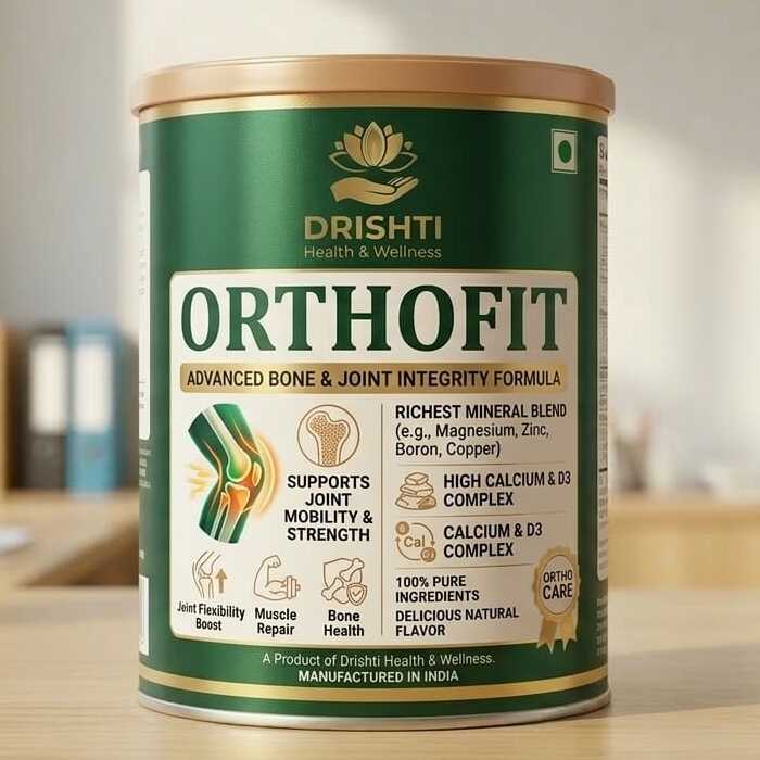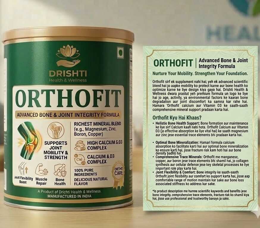 ​Orthofit sirf ek supplement nahi hai; yeh ek advanced scientific blend hai jo aapke mobility ko protect karne aur bone health ko optimize karne ke liye design kiya gaya hai. Drishti Health & Wellness dwara prastut yeh premium formula un logo ke liye hai jo age, activity, ya environmental factors ke kaaran bone degradation aur joint discomfort ka samna kar rahe hai. Hamara ‘Orthofit’ calcium aur Vitamin D3 ke saath-saath comprehensive mineral support pradaan karta hai.