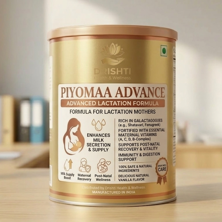 Piyomaa Advance is a specialized post-natal nutritional supplement designed by Drishti Health & Wellness to support breastfeeding mothers. We understand that the nutritional quality of a mother’s diet directly impacts her baby’s growth. Our unique formula is scientifically crafted to enhance milk secretion while helping mothers recover their strength and vitality after delivery.